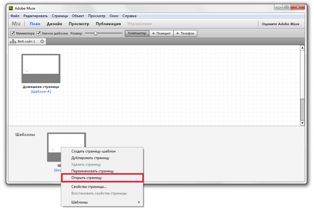 Из списка шаблонов выберете необходимый Вам шаблон, который используется для страниц Вашего сайта и кликните по нему правой кнопкой мыши. В открывшемся контекстном меню выберете пункт Открыть страницу.