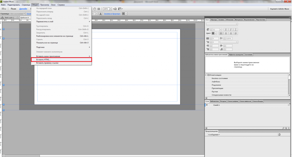 В открывшемся окне редактора в верхнем меню выберете пункт меню Объектвставить HTML….