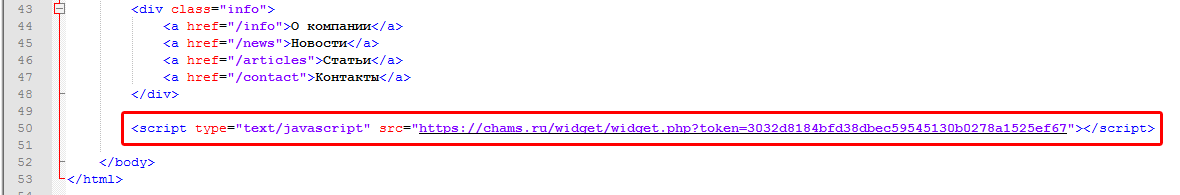 - В файле, который нужно отредактировать, должен содержаться закрывающий тег </body>. Откройте его любым редактором кода, н-р, Notepad++, и перед тегом </body> разместите код вашего виджета.