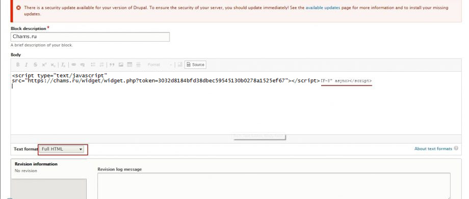 Если, редактор конструктора заменяет специальные символы, и отображение кода виджета в блоке выглядит некорректным, то в формате текста выбираем Editor — Источник(вместо Full HTML)
