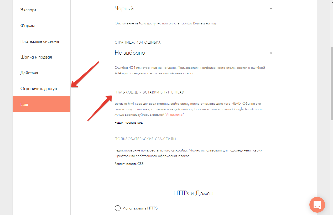 В разделах меню, спускаемся в самый низ и находим «Ещё» и выбираем HTML-код для вставки внутрь HEAD, нажимаем «Редактировать код».