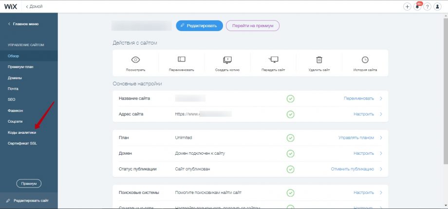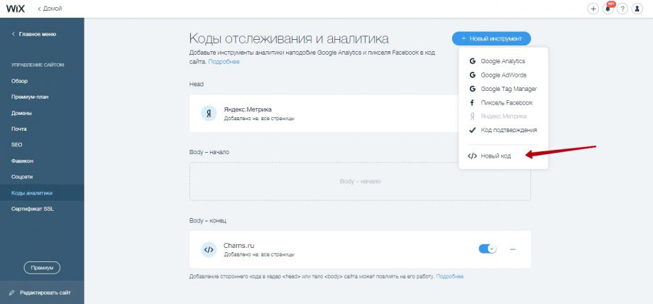 В левом вертикальном меню выбираем пункт Коды Аналитики